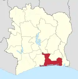 На западе граничит с областью Сюд-Бандама, на северо-западе с областью Фромаже, на севере с областями Лак и Нзи-Комоэ, на северо-востоке с областью Агнеби, на востоке с областями Муайен-Комоэ и Сюд-Комоэ. На юге омывается водами Гвинейского залива.