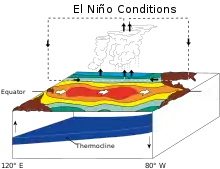 Джейкоб Бьеркнес, норвежско-американский метеоролог, в 1969 году внёс вклад в изучение Эль-Ниньо, высказав предположение, что аномально тёплая зона в восточной части Тихого океана может ослаблять температурную разницу между восточными и западными частями, лишая силы пассаты, которые способствуют перемещению тёплых вод на запад. Результатом этого становится увеличение тёплых масс воды в восточном направлении[8]. Было предложено несколько моделей накопления тёплых масс в верхних слоях экваториальных вод Тихого океана, которые затем опускаются вниз в ходе Эль-Ниньо[9]. После прохождения Эль-Ниньо зона накопления теплоты затем должна несколько лет «подзаряжаться», прежде чем осуществится следующая осцилляция[10].