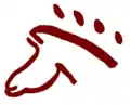 - Четвертая и последняя большая группа располагается напротив предыдущей и тесно связана с ней, так как содержит приблизительно одинаковое количество оленей и лошадей и пару зубров. Из знаков выделяется абстрактный рисунок в форме руки, похожий на найденные в пещере Сантьян,[14] и красный знак, который напоминает гротескную голову зубра. В центре композиции фигурирует типичная двойственность лошади и зубра; в одном конце находится другой зубр, а в противоположном — остальные лошади. Нет плашечных цветов, гравировки, ни дихроизма; напротив, доминирует вязкий, более-менее моделирующий рисунок красного цвета.