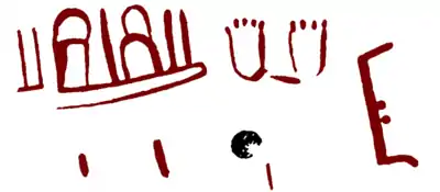 - Надпись в Галерее B — другой из этих сложных и уникальных знаков. Брейль видит в ней настоящую надпись, содержащую код для посвященных. Леруа-Гуран объясняет, что, при разложении на составные, получается рисунок, состоящий из символов женского начала. Жорда видит в надписи типичный знак в форме «мешка», связанный с вышеуказанными огороженными участками и змееобразными знаками, которые появляются в конце Среднего цикла. Касадо Лопес указывает на наличие аналогичных знаков в Марсуле и Фон-де-Гоме. Амелькин предлагает способ прочтения надписи с использованием символов австралийских аборигенов и протоафразийских (препротобаскских) пиктограмм.[21]