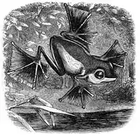 На протяжении своей эволюционной истории несколько не связанных между собой видов лягушек адаптировались к планирующему полёту[67] Некоторые виды лягушек в тропических лесах специализированы для планирования с дерева на дерево или имеют возможность контролируемо прыгать с дерева на землю («парашютирование»). Типичным представителем является лягушка Rhacophorus nigropalmat, обитающая в Малайзии и Борнео. У неё большие ступни, кончики пальцев расширены и оснащены клейкими подушечками, между пальцами есть летательные перепонки, а вдоль конечностей и области таза имеются дополнительные складки кожи. Растягивая пальцы и конечности, эта лягушка может планировать на значительные расстояния (до 15 метров) между деревьями, изменяя по мере надобности направление движения[68][69]