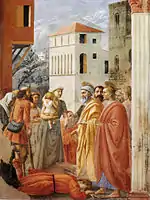 Художник поместил события на современную ему флорентийскую улицу. Мазаччо изобразил её в перспективе, уходящей за спины апостолов. Исследователи считают, что здесь изображён район церкви Сан Феличе на Пьяцца; её запоминающаяся колонна с коринфской капителью видна за спиной Иоанна. На улице расположились дома, характерные для средневековой Флоренции. Нижняя часть фасада крайне левого здания напоминает Палаццо Веккьо, а верхняя Палаццо Питти.