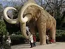 По строению скелета шерстистый мамонт представлял значительное сходство с ныне живущим индийским слоном, которого несколько превосходил величиной, достигая 5,5 м длины и 3,5 м высоты. Громадные бивни мамонта — у самца до 4 м в длину, весом до 100 кг — были расположены в верхней челюсти, выставлялись вперёд, загибались кверху, на них опиралось основание хобота[19]. Голова мамонта была крупнее, чем у современных слонов, спина более покатая.