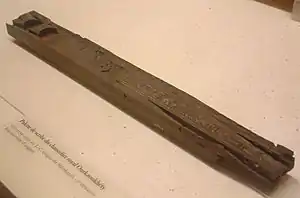 ![]() Деревянная палитра писца, принадлежащая царскому чиновнику Уркаухети, с картушем царя Мерикара, найденная, вероятно, в гробнице близ Асьюта или Меира вместе с медной жаровней Мериибра Хети. Лувр (E 10500) | |
