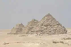 Намного лучше, чем храмы, сохранились пирамиды-спутницы, которые стоят, как обычно, на южной стороне за оградой. Всего их три, причём две не закончены. Самая большая — восточная — с основанием 44,3 × 44,3 метра и высотой 28,3 метра; на ней кое-где ещё сохранилась гранитная облицовка. Две другие (стороны по 31,5 метра и высота 21,2 метра) ступенчатые, что, если принять во внимание время их постройки, весьма странно; очевидно, планировалось придать им форму «истинных». В 1837 году Виз обнаружил в восточной пирамиде большой гранитный саркофаг, в средней — остатки деревянного гроба и человеческих костей, в западной — лишь пустую и незаконченную погребальную камеру. Каждая из трёх пирамид имела заупокойный храм, и все это было огорожено общей каменной стеной. По предположению Рейснера, который в двадцатые годы XX столетия заново провёл их обследование, восточная пирамида принадлежала первой (главной) жене Менкаура. Владельцев или владелиц двух остальных он, как, впрочем, и другие ученые, не рискнул назвать[12].