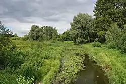 Мирожка. Вид с пешеходной дамбы на проточный пруд с островом