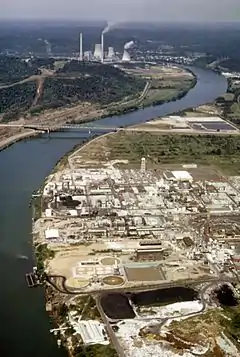 - Фосген, исходно синтезировавшийся как побочный продукт производства фосфатных удобрений на заводах «Монсанто», привлёк внимание УХВ, которое заключило с компанией крупный контракт на закупку указанного БОВ и распорядилось организовать его производство в промышленных масштабах, для чего компанией были созданы два специальных завода по производству монооксида углерода (необходимого компонента для получения оксид-дихлорид углерода, то есть фосгена). Построенный в 1944 году Дакриверский химический завод (Duck River CWS Plant) близ Колумбии, штат Теннесси, строительство которого началось в мае 1944 года, уже в феврале 1945 года выпустил первую партию смертоносного вещества,[24] а вскоре после запуска в линию выдавал 36 тонн порошкообразного фосгена в сутки. За два месяца были созданы значительные запасы фосгена, превышавшие возможности Департамента армии США по организации его складского хранения, в связи с чем в апреле того же года производство было прекращено;[25]