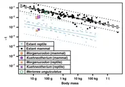 Двойная диаграмма, построенная с учётом влияния филогении (Log10 PGLS), показывающая отношение значений массы тела (г) и постоянной K (в днях−1) темпов роста после рождения для современных млекопитающих (n = 115), современных рептилий (n = 33) и ископаемых маммалиаформ (оценка)