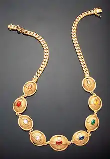 Наваратной также называют ожерелье из этих девяти драгоценных камней. В индуизме считается, что наваратна обладает особыми магическими качествами и может оказывать положительное влияние на жизнь того, кто её носит. Авторы ЭСБЕ перечисляют следующие камни: жемчуг, рубин, топаз, бриллиант, изумруд, ляпис-лазурь, коралл, сапфир и гомед[1].