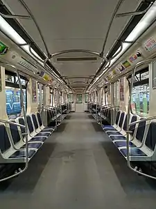 Основные диваны расположены между дверными проёмами с каждой стороны вагона и состоят из шести раздельных сидячих мест каждый, а в торцевых частях вагонов между крайними дверями и торцевыми стенами — малые диваны, состоящие из трёх сидячих мест аналогичной конструкции. В общей сложности головные вагоны имеют по 42 сидячих места (включая 6 откидных), а промежуточные — по 48 (включая 12 откидных). Общая же пассажировместимость вагона в нормальных условиях (при населённости, равной 5 человек/м²) составляет 188 мест, в часы пик (населённость — 8 человек/м²) может доходить до 272 мест[38][39]. В салоне головного вагона (81-556) сидячих мест — 42, а пассажирвместимость составляет 174 и 253 места для населённости 5 и 8 человек/м², соответственно[40].
