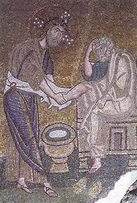 - Омовение ног (мозаика находится в хорошей сохранности). Является характерным примером провинциальной мозаичной школы[15] — строгие аскетичные восточные лица, вытянутые пропорции фигур, лица переданы сочетаниями зелёных, красных, жёлтых, розовых, белых и чёрных цветов. Общая композиция наполнена суровостью и напряжённостью, при этом духовная экспрессия отделена от характеров отдельных персонажей;