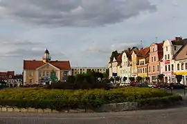 Häuser am ehemaligen Marktplatz, im Hintergrund das Rathaus