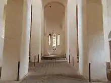 Северный и средний нефы церкви имеют одинаковую ширину, южный — значительно уже. Подпружные арки переброшенные от западной пары столбов опираются на выступающие из стены пилястры, тогда как арки от восточных (алтарных) столбов связаны со стеной через выступающие массивные плиты-импосты. Апсиды храма полуциркульные и небольшого размера. Средняя из них незначительно выступает относительно боковых на 25-30 сантиметров и слегка возвышается над ними. Система перекрытий изначально была аналогична таковой у Северного и Среднего храмов: двускатные и односкатные кровли из тонких песчаниковых блоков с выступающими навесами для стока воды[30].