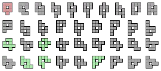 1050 двусторонних нонамино (все, кроме 235, в число которых входят и 37 «дырявых» нонамино) покрывают плоскость[17][18][19]; 1048 из этих 1050 нонамино либо удовлетворяют критерию Конвея самостоятельно, либо способны сформировать «заплатку» из двух копий нонамино, удовлетворяющую критерию Конвея. Два исключительных нонамино, которые покрывают плоскость, несмотря на отрицательный результат проверки по критерию Конвея, показаны на рисунке справа; 9 — наименьшее число, для которого существуют подобные исключения[20].