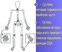 Чаще всего при остеоартрозе поражаются суставы кисти, первый плюснефаланговый сустав стопы, суставы шейного и поясничного отделов позвоночника, коленных и тазобедренных суставов. Однако по тяжести нарушения функции опорно-двигательного аппарата первое место занимают тазобедренный, коленный и голеностопный суставы, а также плечевой сустав[11].