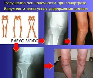 Исход артроза — полное разрушение сустава с формированием анкилоза — полной неподвижности сустава или неоартроза с неестественной подвижностью. Это сопровождается тяжёлым нарушением функции конечности. В последнее время, не дожидаясь исхода заболевания, все чаще применяют специальные операции по замене сустава протезом — эндопротезирование сустава. На рисунке изображена типичная для терминальной стадии артроза коленного сустава варусная деформация колена в сочетании с боковой патологической нестабильностью коленного сустава. Артроз блоковидного или шаровидного сустава, такого как тазобедренный, завершается анкилозированием. При этом замыкание сустава обычно происходит в нефизиологическом (порочном) положении конечности. В данном случае мы видим бедро в положении сгибания и приведения, при котором нога укорачивается, а ось конечности и биомеханика опорно-двигательной системы существенно нарушается.