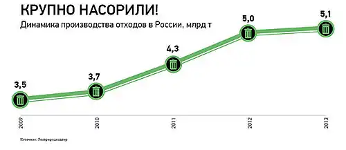 В 2013 году Президент России Владимир Путин заявил также о необходимости создать систему регулирования сбора и утилизации мусора, сформировать рыночные и административные инструменты, которые обеспечивали бы эффективное обращение с отходами.[13] В 2016 году в России стартовала новая реформа сбора и переработки мусора.