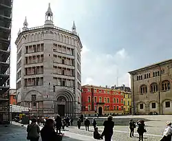 - Баптистерий представляет собой восьмиугольную башню, облицованную розовым мрамором. Здание построено тем же Антелами в 1196—1260 годах в романо-готическом стиле. Он же создал рельефные украшения на фасаде и внутренних стенах здания. На куполе изнутри имеются фрески из жизни Христа.