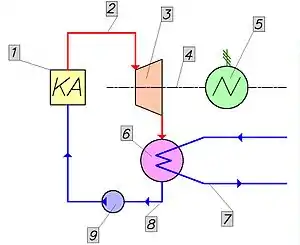 Схема работы конденсационной турбины: Свежий (острый) пар из котельного агрегата (1) по паропроводу (2) попадает на рабочие лопатки паровой турбины (3). При расширении кинетическая энергия пара превращается в механическую энергию вращения ротора турбины, который расположен на одном валу (4) с электрическим генератором (5). Отработанный (мятый) пар из турбины направляется в конденсатор (6), в котором, охладившись до состояния воды путём теплообмена с циркуляционной водой (7) пруда-охладителя, градирни или водохранилища по трубопроводу (8) направляется обратно в котельный агрегат при помощи насоса (9). Бо́льшая часть полученной энергии используется для генерации электрического тока.