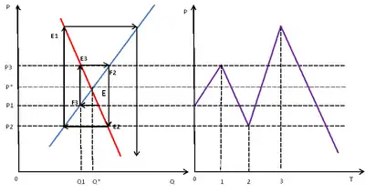 В случае изменения (падения) количества производства до уровня , что соответствует точки на кривой спроса, равной цене , что выше равновесной цены . Новая цена стимулирует производителей производить больше, равной точки на линии предложения, но покупатели готовы покупать только по цене , что соответствует точке на кривой спросе, а значит производители принимают решение сократить производство до уровня на кривой предложения, что позволяет поднять цены до уровня , что соответствует точке на кривой спроса и так далее до точки равновесия [10].