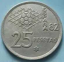 | 25 песет | 1957 (58, 59, 61, 64-75) | медно-никелевый сплав [Cu75Ni25] | 26,50 | 8,50 | 2,10 | Изображение Ф. Франко, («FRANCISCO FRANCO CAUDILLO DE ESPAÑA POR LA G. DE DIOS»), внизу год «1957», по кругу бусовый ободок | Герб Испании, вверху справа номинал «25/PTAS», внизу слева 6-конечная звезда с годом чеканки, по кругу бусовый ободок | * UNA *|* GRANDE *|* LIBRE *|* |