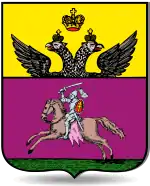 - в червлёном поле всадник в латах и шлеме на белом коне. В правой руке к него обнаженный меч, а в левой щит с шестиконечным крестом, на коне седло с тремя концами;