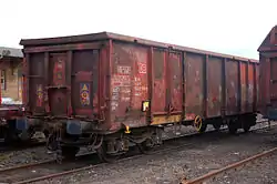 - Полувагон — представляет собой вагон без крыши, что позволяет выполнять механизированную загрузку сразу в кузов; особенно это удобно в случае с сыпучими грузами. Предназначен для перевозки грузов, которые не боятся атмосферных осадков (например, уголь)[22]. Его специализированными разновидностями являются хоппер и думпкар. Первый имеет кузов в виде бункера (может быть как открытым, так и крытым), пол в нижней части которого выполнен в виде одной или нескольких воронок, позволяя производить разгрузку сыпучих грузов за счёт силы тяжести, что значительно ускоряет процесс[23]. Думпкар, он же вагон-самосвал, имеет опрокидывающийся кузов, который вращается в поперечном направлении. Получил широкое распространение в промышленном транспорте, в том числе в работе на карьерах[24].