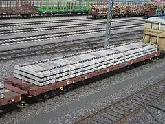 - Платформа — как понятно из названия, представляет собой платформу, по периметру которой имеются небольшие откидные борта. Предназначен для перевозки штучных, длинномерных и сыпучих грузов, которые не боятся атмосферных воздействий (например, ISO-контейнеры, сваи, автомобили). Специализированными разновидностями платформы являются контейнеровоз (без бортов и пола, а рама оборудована специальными упорами), открытый автовоз (двухъярусный, а иногда и трёхъярусный пол), лесовоз (установлены торцевые стенки, а вместо боковых бортов — дополнительные стойки), а также транспортёр (многоосный вагон для перевозки сверхтяжёлых и/или крупногабаритных грузов)[25].