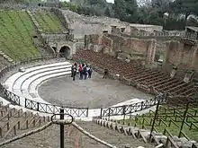 Одеон, построенный в 80 году до н. э. дуумвирами Марком Порцием и Квинктом Валгом, был покрыт четырёхскатной черепичной кровлей. 4 нижних ряда отделялись от верхних 17 высоким парапетом, от которого сохранилась левая (относительно сцены) часть. Театр вмещал около 1500 зрителей, на его сцене проходили музыкальные представления и комедии[11].