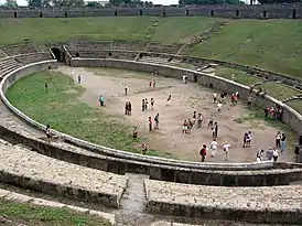 Амфитеатр в Помпеях, вмещавший 20 000 зрителей, был построен около 80 года до н. э. одновременно с малым театром теми же дуумвирами. Имеет размеры 135 на 104 м и в настоящее время является древнейшим известным амфитеатром. Отличается от остальных тем, что входы в него находились в верхней части зрительного зала, а также отсутствием подвальных помещений: выход гладиаторов на арену осуществлялся через коридор прямо с улицы. Через второй коридор выносили раненых и убитых.