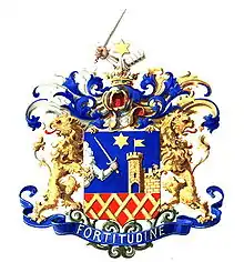Щит увенчан дворянским коронованным шлемом. Нашлемник: правая рука в серебряных латах, положенная на локоть, держит серебряный меч. На сгибе лат сверху золотая шестиугольная звезда. Намёт: справа — лазуревый с серебром, слева — лазуревый с золотом. Щитодержатели: два золотых льва, с головами, повёрнутыми назад, с червлёными глазами и языками. Девиз: «FORTITUDINE» серебряными буквами на лазуревой ленте.