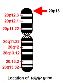 Был идентифицирован ген, кодирующий нормальный белок PrP — PRNP[79], локализованный на 20-й хромосоме. При всех наследственных прионных заболеваниях имеет место мутация этого гена. Было выделено много различных мутаций (около 30[10]) этого гена, и получающиеся при этом мутантные белки более склонны к укладке в ненормальную (прионную) форму[76]. Все такие мутации наследуются аутосомно-доминантно[10]. Это открытие показало дыру в общей теории прионов, гласящей, что прионы могут переводить в прионную форму только белки идентичного аминокислотного состава. Мутации могут иметь место по всему гену. Некоторые мутации приводят к растяжению октапептидных повторов на N-конце белка PrP. Другие мутации, приводящие к появлению наследственной прионной болезни, могут происходить в позициях 102, 117 и 198 (синдром Герстмана — Штраусслера — Шейнкера), 178, 200, 210 и 232 (болезнь Крейтцфельдта — Якоба) и 178 (фатальная семейная бессонница).