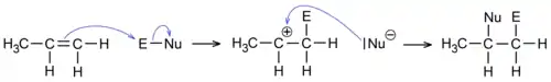 Пропилен обладает широким набором химических свойств, которые определяются наличием двойной углерод-углеродной связи. Прежде всего, пропилен склонен к реакциям присоединения с разрывом π-связи. Эти превращения часто протекают по гетеролитическому типу и относятся к реакциями электрофильного присоединения[1][7].