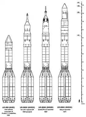 Начиная с июля 1965 года началась разработка трёхступенчатого варианта РН УР-500К (8К82К «Протон-К»). Новая РН была также разработана в филиале № 1 ОКБ-52. РН «Протон-К» должна была использоваться для вывода на отлётную траекторию новых КА для облёта Луны. Кроме того, начались работы над четвёртой ступенью РН «Протон-К» на базе пятой ступени ракеты-носителя Н-1, получившей название блок Д. Согласно этому проекту (УР-500К-Л-1), двухсекционный корабль 7К-Л1 (вариант «Союза») выводился на отлётную траекторию для полёта к Луне, совершал облёт Луны и благополучно возвращался. Полёты были запланированы сначала в беспилотном, а затем в пилотируемом вариантах[19][28].