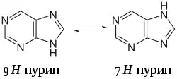 Для пурина характерна прототропная таутомерия по имидазольному атому водорода, в водных растворах в таутомерном равновесии присутствует смесь 7H- и 9H-таутомеров: