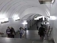 Высокие, расширяющиеся в сторону центрального и боковых залов колонны образуют изящные аркады. На их общие антаблементы опираются простые полуцилиндрические своды. Арки украшены декоративными фризами с рельефными изображениями пальмовых ветвей и розеток[12]. Каннелюры на колоннах, по замыслу архитекторов, зрительно облегчают и подчёркивают стройность колонн. Ритм колонн нарушается двумя лестничными спусками перехода, что, по мнению авторов станции, ослабляет впечатление однообразия и монотонности[13]. Вся станция выдержана в белой цветовой гамме[12].