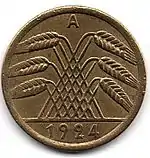 - Тираж 5 пфеннигов (1924—1936) по монетным дворам: 1924A—14 468 655, 1924D—8 138 859, 1924E—5 976 000, 1924F—3 134 000, 1924G—4 790 000, 1924J—2 200 000, 1925A—85 238 508, 1925D—39 750 400, 1925E—17 554 000, 1925F—20 990 000, 1925G—10 231 839, 1925J—10 949 928, 1926A—22 377 164, 1926E—5 990 000, 1926F—2 871 136, 1930A—7 418 109, 1935A—19 178 219, 1935D—5 480 249, 1935E—2 383 800, 1935F—4 585 428, 1935G—2 652 048, 1935J—2 614 400, 1936A—36 992 383, 1935D—8 108 128, 1935E—2 980 800, 1935F—6 643 170, 1935G—2 273 773, 1935J—4 469 944