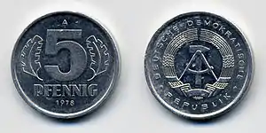 - Тираж 5 пфеннигов (1950—2001) по годам и монетным дворам: 1950D—271 962 143, 1950F—342 284 033, 1950G—180 492 176, 1950J—285 282 756, 1966D—26 035 893, 1966F—30 047 732, 1966G—17 332 584, 1966J—26 740 599, 1967D—10 418 350, 1967F—12 013 773, 1967G—1 736 000, 1967J—10 706 211, 1968D—13 046 907, 1968F—15 029 039, 1968G—13 854 964, 1968J—13 362 338, 1969D—23 488 481, 1969F—27 051 398, 1969G—15 630 841, 1969J—24 120 435, 1970D—39 940 099, 1970F—45 521 941, 1970G—27 637 767, 1970J—40 872 935, 1971D—57 345 490, 1971F—66 434 048, 1971G—38 284 466, 1971J—58 566 000, 1972D—52 325 012, 1972F—60 300 174, 1972G—34 718 676, 1972J—54 218 000, 1973D—15 595 519, 1973F—18 048 386, 1973G—10 390 987, 1973J—16 055 000, 1974D—15 768 621, 1974F—18 177 844, 1974G—10 507 725, 1974J—16 055 000, 1975D—15 714 890, 1975F—18 055 849, 1975G—10 466 021, 1975J—16 201 120, 1976D—47 091 157, 1976F—54 412 872, 1976G—31 366 899, 1976J—48 321 120, 1977D—52 159 230, 1977F—60 174 601, 1977G—34 740 585, 1977J—53 531 620, 1978D—41 755 483, 1978F—48 070 736, 1978G—27 811 179, 1978J—42 823 620, 1979D—41 777 454, 1979F—48 224 016, 1979G—27 841 344, 1979J—42 809 120, 1980D—52 110 370, 1980F—60 110 370, 1980G—34 710 370, 1980J—53 487 370, 1981D—57 291 120, 1981F—66 091 120, 1981G—38 151 120, 1981J—58 831 120, 1982D—57 546 120, 1982F—66 378 120, 1982G—38 319 120, 1982J—59 093 120, 1983D—46 875 120, 1983F—54 075 120, 1983G—31 215 120, 1983J—48 135 120, 1984D—36 463 870, 1984F—42 063 935, 1984G—24 283 870, 1984J—37 443 870, 1985D—15 656 806, 1985F—18 054 067, 1985G—10 434 731, 1985J—16 073 887, 1986D—36 444 120, 1986F—42 044 120, 1986G—24 264 120, 1986J—37 424 120, 1987D—52 045 120, 1987F—60 045 120, 1987G—34 645 120, 1987J—53 445 120, 1988D—62 445 120, 1988F—72 045 120, 1988G—41 565 120, 1988J—64 125 120, 1989D—93 645 120, 1989F—108 045 120, 1989G—62 325 120, 1989J—96 165 120, 1990A—70 000 000, 1990D—93 645 120, 1990F—108 045 120, 1990G—62 325 120, 1990J—96 165 120, 1991A—128 000 000, 1991D—134 400 000, 1991F—153 600 600, 1991G—89 600 000, 1991J—134 400 000, 1992A—28 000 000, 1992D—29 400 000, 1992F—33 600 000, 1992G—19 600 000, 1992J—29 400 000, 1993A—36 000 000, 1993D—37 800 000, 1993F—43 200 000, 1993G—25 200 000, 1993J—37 800 000, 1994A—38 000 000, 1994D—39 900 000, 1994F—45 600 000, 1994G—26 600 000, 1994J—39 900 000, 1995A—48 000 000, 1995D—50 400 000, 1995F—57 600 000, 1995G—33 600 000, 1995J—50 400 000, 1996—2001A—48 000 000, 1996—2001D—50 400 000, 1996—2001F—57 600 000, 1996—2001G—33 600 000, 1996—2001J—50 400 000