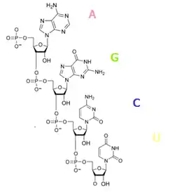 Нуклеотиды РНК состоят из сахара — рибозы, к которой в положении 1' присоединено одно из оснований: аденин, гуанин, цитозин или урацил. Фосфатная группа соединяет рибозы в цепочку, образуя связи с 3' атомом углерода одной рибозы и в 5' положении другой. Фосфатные группы при физиологическом рН отрицательно заряжены, поэтому РНК — полианион. РНК транскрибируется как полимер четырёх оснований (аденина (A), гуанина (G), урацила (U) и цитозина (C), но в «зрелой» РНК есть много модифицированных оснований и сахаров[14]. Всего в РНК насчитывается около 100 разных видов модифицированных нуклеотидов, из которых 2'-О-метилрибоза наиболее частая модификация сахара, а псевдоуридин — наиболее часто встречающееся модифицированное основание[15].