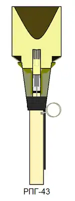 Граната РПГ-43 имеет корпус с плоским дном и конической крышкой. Под крышкой располагается жало и пружина запала. Инерционный запал, двухленточный стабилизатор и предохранительный механизм находятся в съемной рукоятке. При приведении гранаты в боевое положение необходимо снять рукоятку и вращением запала взрывателя поджать его пружину. Затем рукоятка вновь присоединяется и за кольцо выдергивается предохранительный шплинт. После броска гранаты от неё отделяется предохранительная планка, колпак стабилизатора сползает с рукоятки, вытягивая стабилизатор, при этом взводя запал.
