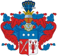Щит, разделённый горизонтально надвое, имеет верхнюю половину малую голубого цвета с изображением на ней трех серебряных шестиугольных звезд (польский герб Гвязды). Нижнюю пространную, в которой в правом красном поле крестообразно положены серебряные стрела и шпага остриями вниз (изм. польский герб Пржестржал), а в левом серебряном поле Рак красного цвета (польский герб Варня).