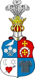 Щит увенчан дворянскими шлемом и короной. Нашлемник: три страусовых пера.