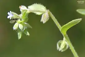 Цветки мелкие, правильные, на коротких цветоножках, собраны в верхушечные рыхлые завитки. Чашечка до основания 5-раздельная; доли от линейных до ланцетных, сначала короткие и прямые, при плодах удлинённые и серповидно загнутые вовнутрь. Венчик воронковидный, светло-голубой; трубка короткоцилиндрическая, прямая или слегка изогнутая; зев с 5 небольшими чешуйками; отгиб маленький, голубой, 5-раздельный. Тычинки спрятаны в нижней части трубки венчика; нити короткие; пыльники продолговатые. Завязь с выпяченными гнёздами; семязачатков 2. Столбик цельный, спрятан в трубке венчика; рыльце головчатое. Гинобазис шиловидный. Орешков (1) 2, односемянные, бугорчатые.