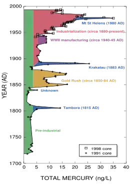 До индустриальной революции осаждение ртути из атмосферы составляло около 4 нанограммов на 1 кубический дециметр льда. Природные источники, такие как вулканы, составляют примерно половину всех выбросов атмосферной ртути. Причиной появления остальной половины является деятельность человека. В ней основную долю составляют выбросы в результате сгорания угля (главным образом в тепловых электростанциях) — 65 %, добыча золота — 11 %, выплавка цветных металлов — 6,8 %, производство цемента — 6,4 %, утилизация мусора — 3 %, производство соды — 3 %, чугуна и стали — 1,4 %, ртути (в основном для батареек) — 1,1 %, остальное — 2 %.