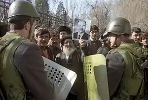 В 1987 году на территории СССР разгорается ряд межнациональных конфликтов, самым острым[93] из которых становится Карабахский конфликт, начиная с 1988 года происходят массовые погромы как армян, так и азербайджанцев[94][95][96][97]. В 1989 году Верховный Совет Армянской ССР объявляет о присоединении Нагорного Карабаха, Азербайджанская ССР начинает блокаду. В апреле 1991 между двумя союзными республиками фактически начинается война.