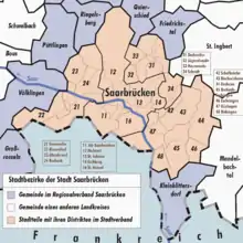 Территория города в соответствии с первым параграфом «Положения о деление города Саарбрюккен на городские районы» (нем. § 1 der „Satzung über die Einteilung der Landeshauptstadt Saarbrücken in Stadtbezirke“) состоит из 4 городских округов: Центр, Дудвайлер, Запад и Хальберг. При этом Дудвайлер имеет собственную администрацию. В каждом городском округе имеется также окружной совет с бургомистром, которые рассматривают важные, затрагивающие округ, вопросы, однако окончательное решение принимает городской совет. Каждый округ подразделяется на районы, однако только в целях статистики.