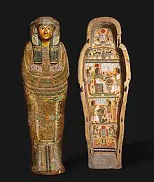 Надписи на древнеегипетских саркофагах содержат имя умершего, а также заклинания и молитвы, обращённые к богам и призванные защитить тело умершего от всякого зла. Древнеегипетские саркофаги покрывались медными позолоченными или золотыми листами.