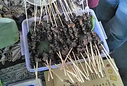 Достаточно экзотические виды сате можно найти и во многих другим местностях Индонезии, хотя и там, как правило, наиболее популярными являются сате из «обычных» продуктов. Так, в столице страны Джакарте в числе прочих делают шашлычки из кобры и из зачаточных неснесённых яиц, извлекаемых из куриных тушек[44][45]. В Бандунге на сате идёт мясо варана[46], в Богоре — томлёная в специях телячья кожа[47], в Маланге — козьи кишки, которые перед нанизыванием на шампур складывают плотной «гармошкой»[48], в некоторых районах Бали — собачатина[49], в Медане и на Молукках — моллюски[50][51], в Пурвореджо — гусеницы[52].