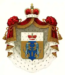 Щит, разделённый горизонтально надвое, имеет вершину малую с изображением в горностаевом поле княжеской шапки, а нижнюю пространную в которой в золотом поле на голубой посередине полосе поставлены два льва переменных с полями цветов, имеющие в передних лапах золотую стрелу, остриём вверх обращённую.