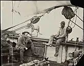 Сидят слева направо: Якобсен, Нурдал, Юхансен, Свердруп (в котелке), Амундсен, Блессинг, Петерссен